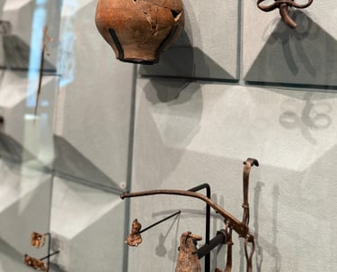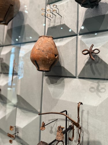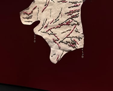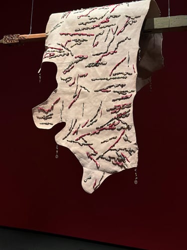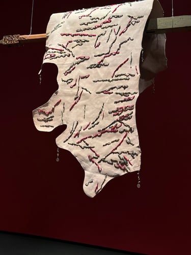 Site visits shaped this reading. At London Mithraeum, fragments and small artefacts are presented so that the ground operates as knowledge. The broken pot that still holds its curve teaches how residue can carry time. That logic supports my choice to keep shards and to place them where a line can continue across absence. At the Barbican Curve, Citra Sasmita’s installation combined textile, hide and architectural rhythm to build a world that is read through spacing and repetition rather than through a single image. The beaded surfaces hung in relation to pillars made a passage that the body had to measure. This reinforced my belief that arrangement and pace can hold environmental thought without illustration.