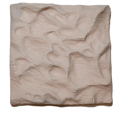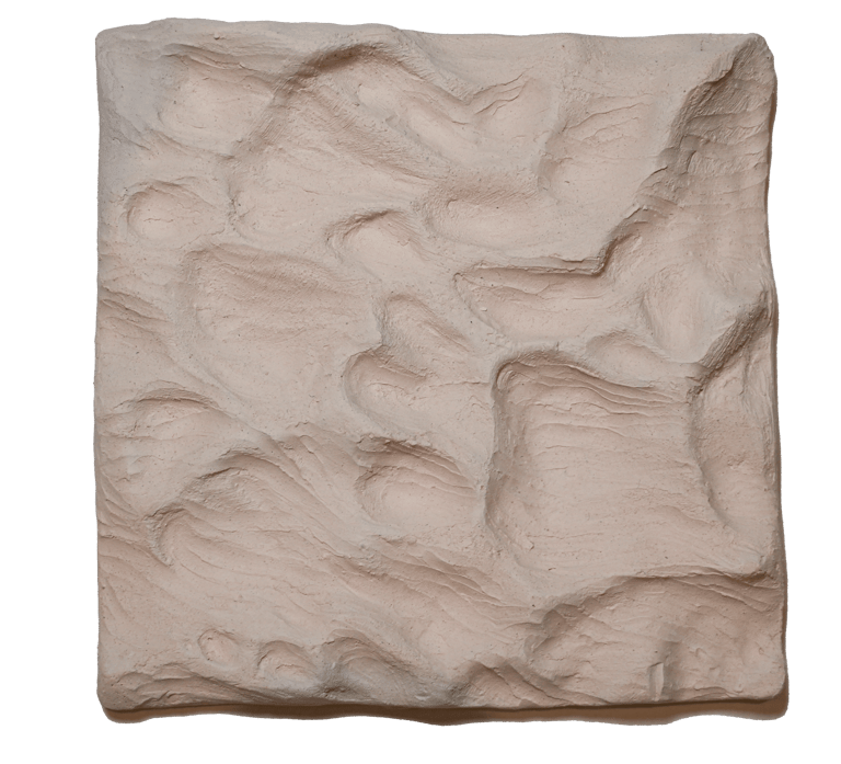 A beach visit to Rye made this clear. At low tide the wet sand held crisp channels, soft ridges and sudden sinks. In the studio I tested shallow ceramic reliefs that echo this register. Earlier work staged environmental elements through broad zones of colour. That impulse is quieter here. A sift of sand travels inside a pour and settles into lines that carry the subject through behaviour rather than depiction. A faint pigment drift becomes a tide mark. The environment arrives as action in matter.