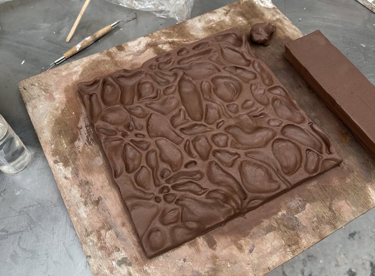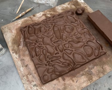This reflection begins in the studio, with materials that act in time. Resin cures and holds shallow depth. Clay dries and shrinks and records a fine line where air has drawn out moisture. Sand moves inside a pour and settles into channels. I learned to keep these actions visible so that the surface can be read like a shore. I position the practice within expanded drawing, not illustration. By this I mean that drawing operates as a spatial condition rather than a picture. The chapters follow headings proposed in tutorials with my course tutor Sarah and through feedback from peers and visiting tutors. They show how separate studies became one installation and how that installation clarified an ethic of care and repair at the heart of the work. I refer to earlier pieces when they help the argument, but the focus remains on the present body of work. My earlier work already traced water as presence and as a trace. Layered inks and resin suggested hidden depth and a soft atmosphere that changed with the viewer’s movement. Those images taught rhythm and restraint. When I entered the course the questions moved from image into matter. I began simple tests with resin, sand, clay and pigment to see how each behaves over time. In Unit 2 I made the first families of relief tiles and silicone skins. The work titled When the Water Left brought the language together for the first time. Clay kept dry edges and fine lines like the memory of retreat. I still thought in single statements. Unit 3 taught me to think in fields and fragments. What began as a picture of water became a condition where matter remembers time.